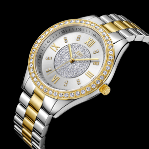 - LUXURIOUS CASE & BRACELET: The Women’s Mondrian watch features a 18K gold bezel with Swarovski crystals around the face, gold hour markers, and a two-tone stainless steel silver and 18K gold-plated three link metal band