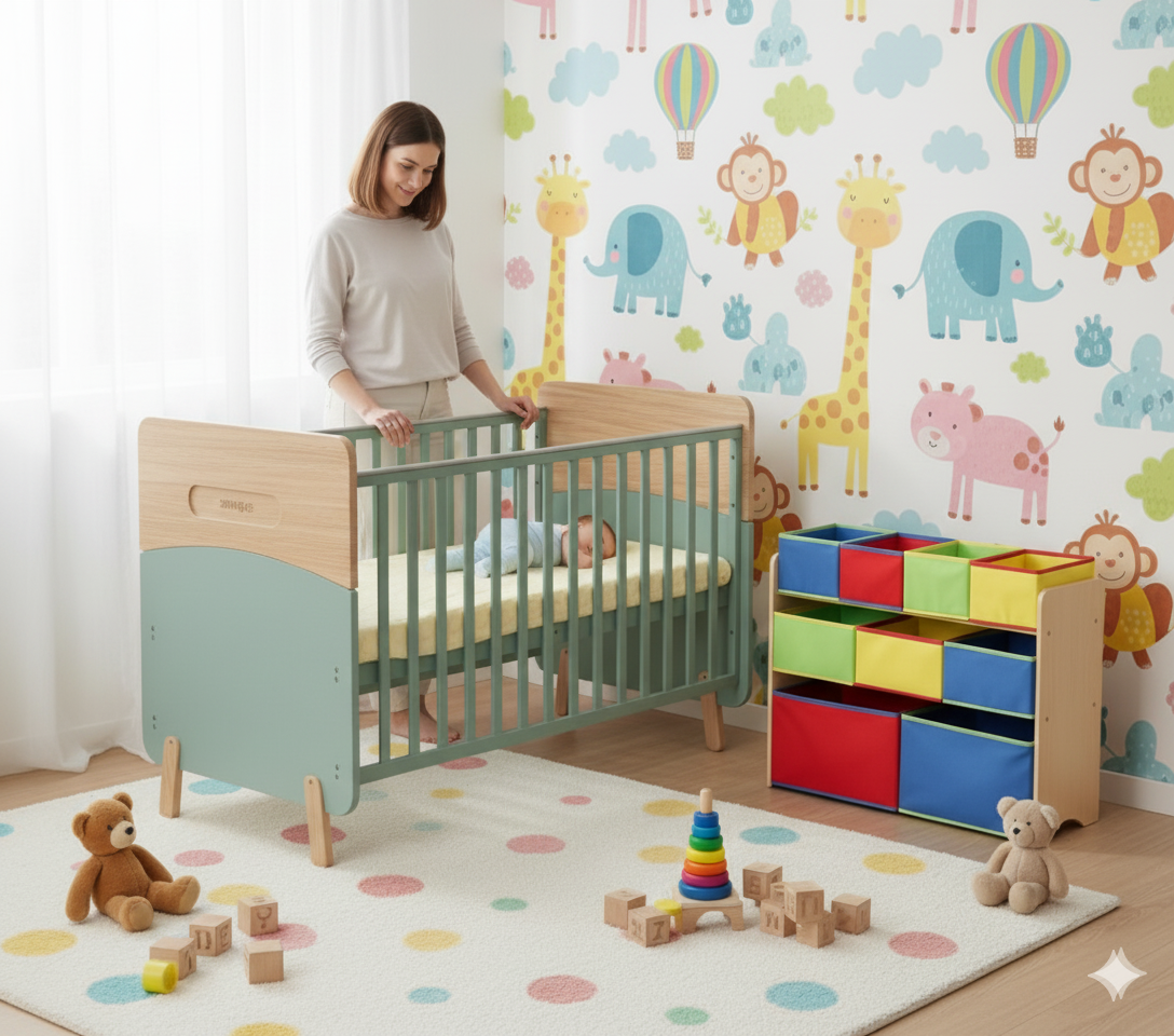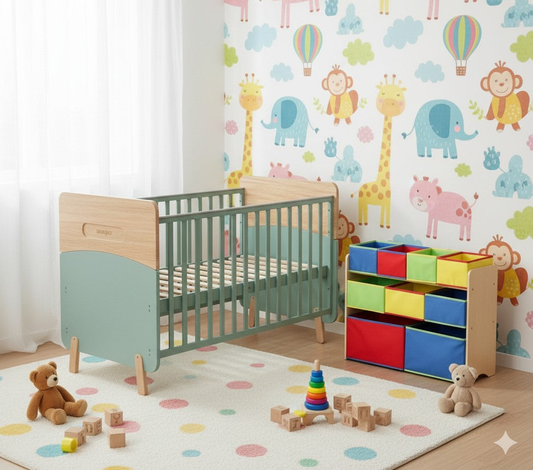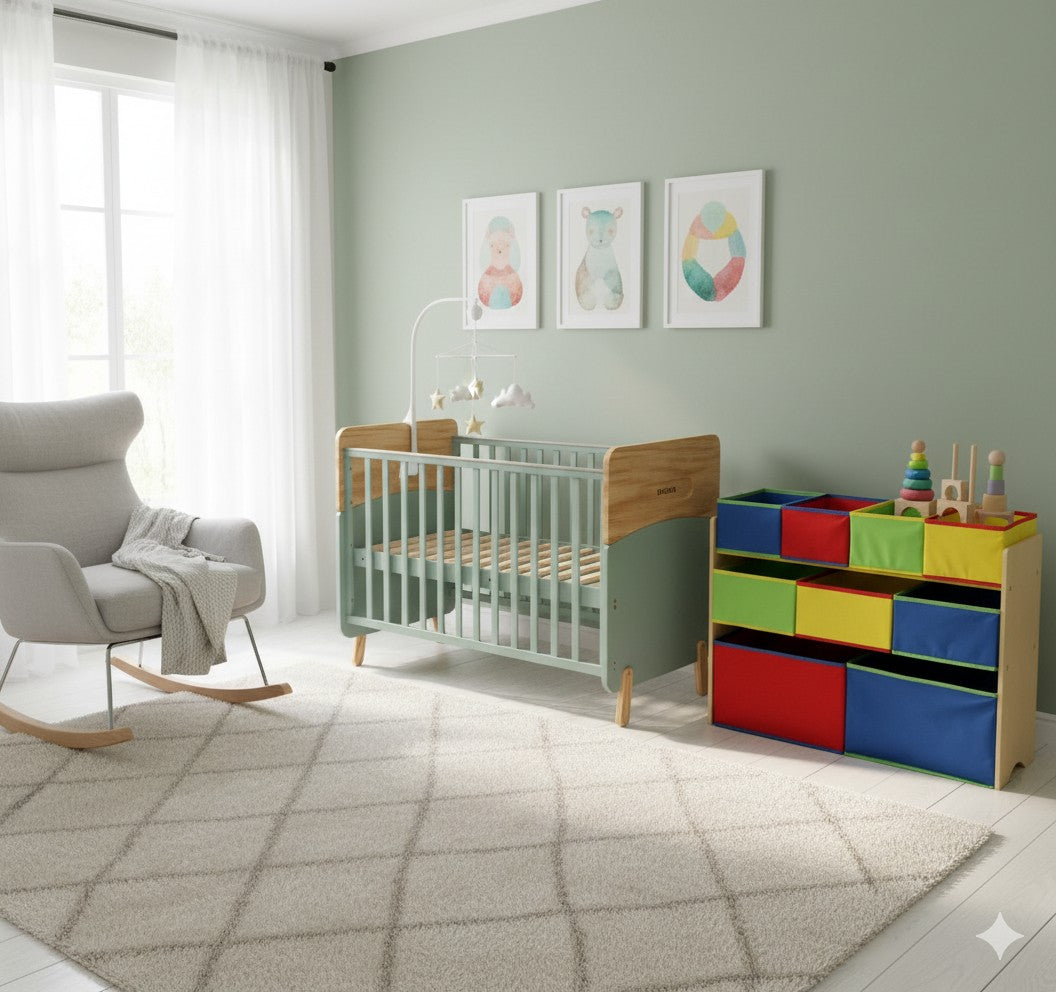 Zrafh Wooden Baby Crib convert to Toddler Bed with Mosquito Net, Green/Almond - WBB910-1 with Dreeba Large Storage Organizer for Toys, Books and Baby Supplies 9 Foldable Fabric Bins Multicolor